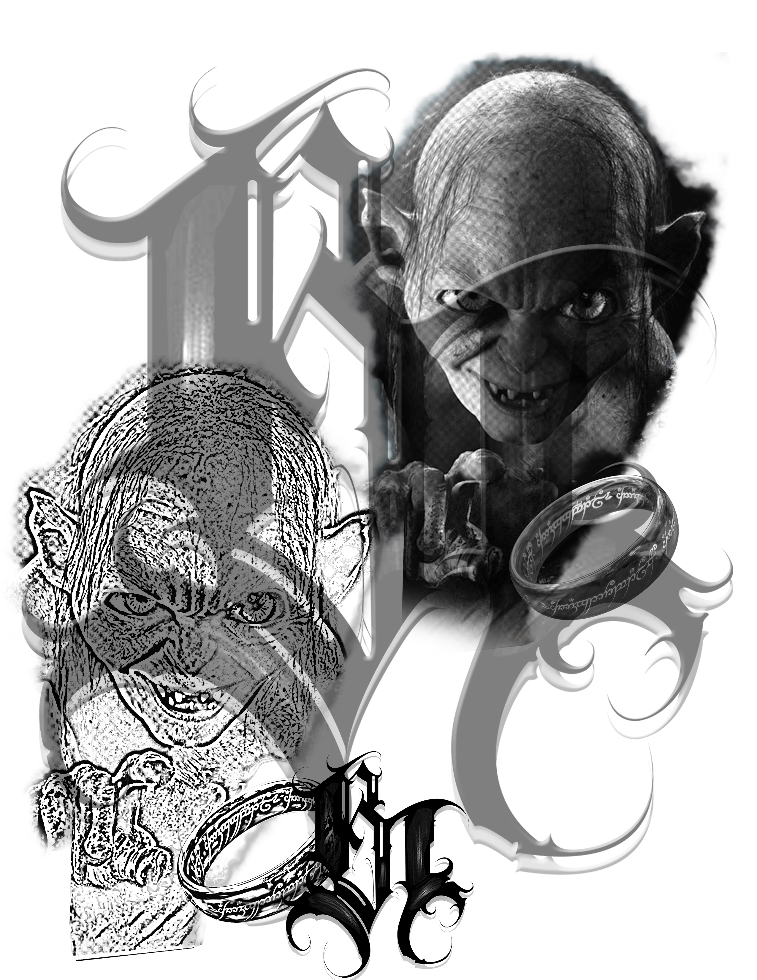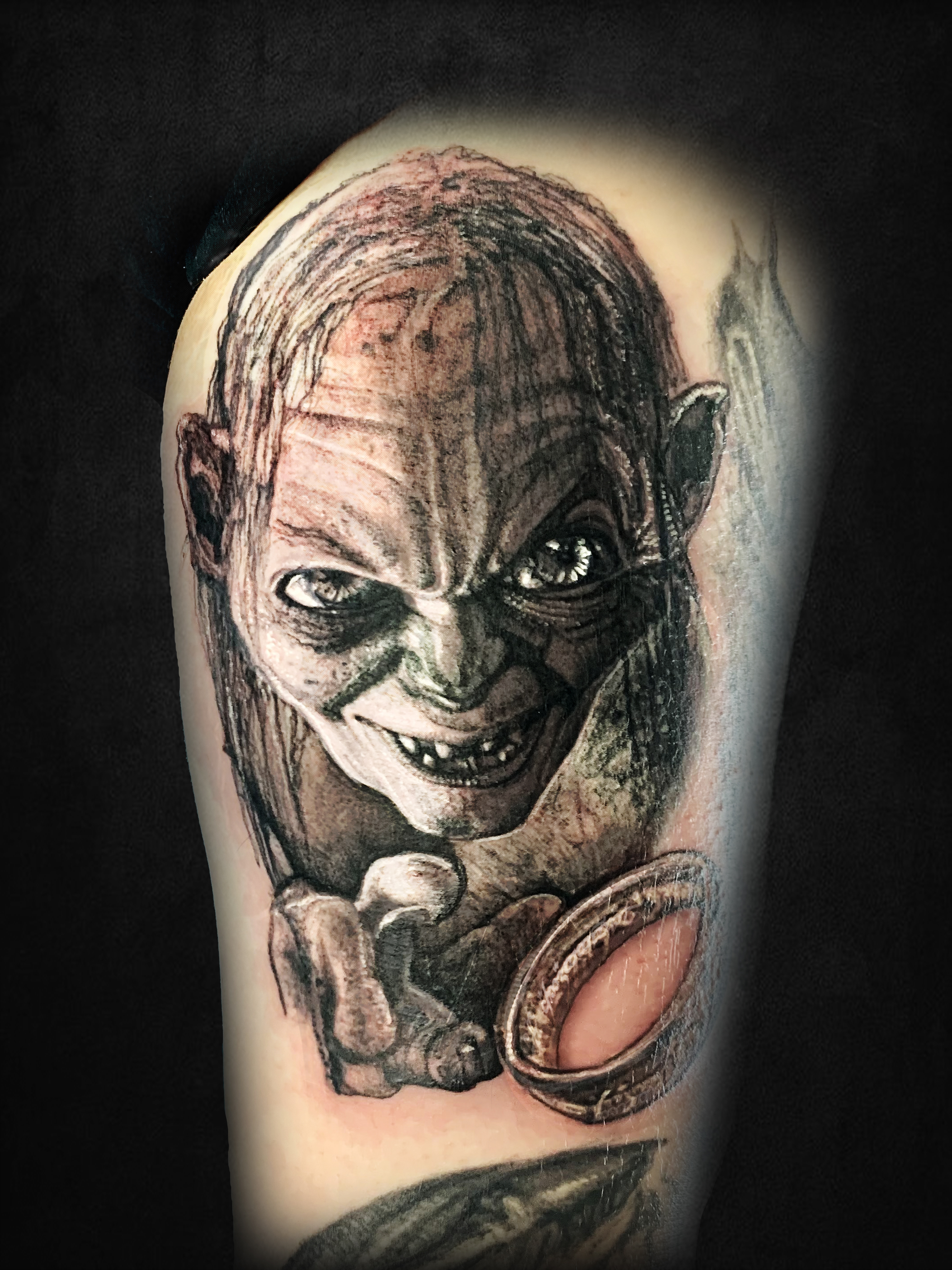 Gollum from Lord of the Rings. Black and Grey Tattoo Portrait. On Clients Tricep.