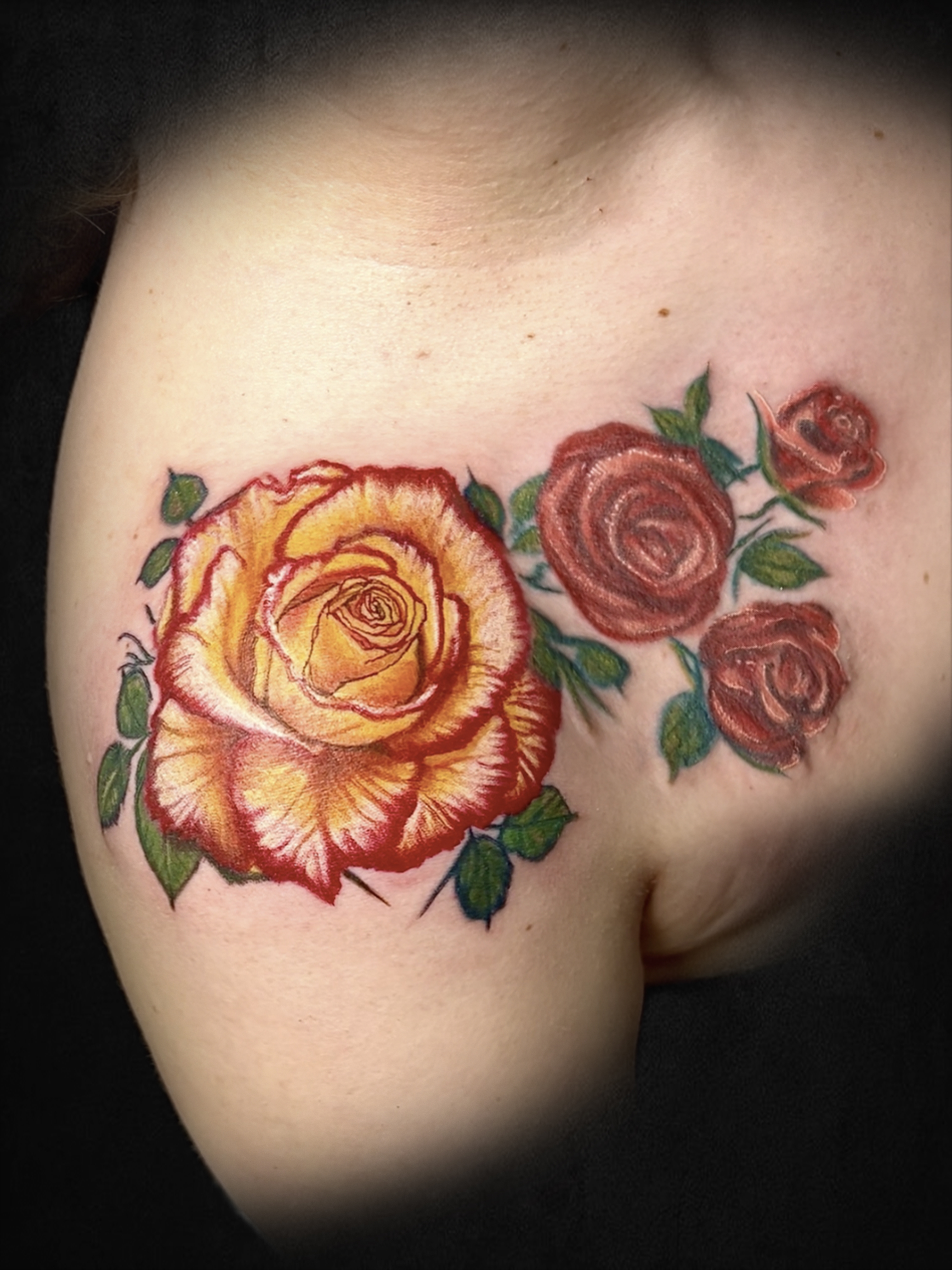 Yellow and Red Roses flowing down Clients Shoulder and Collarbone. Color. Realism.