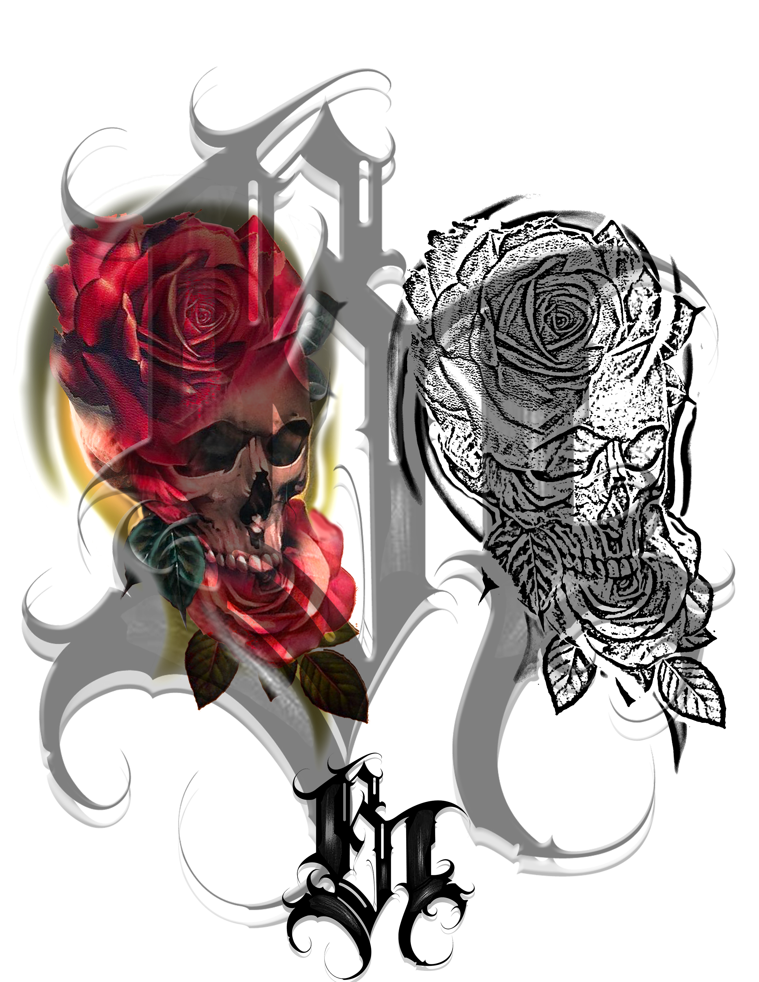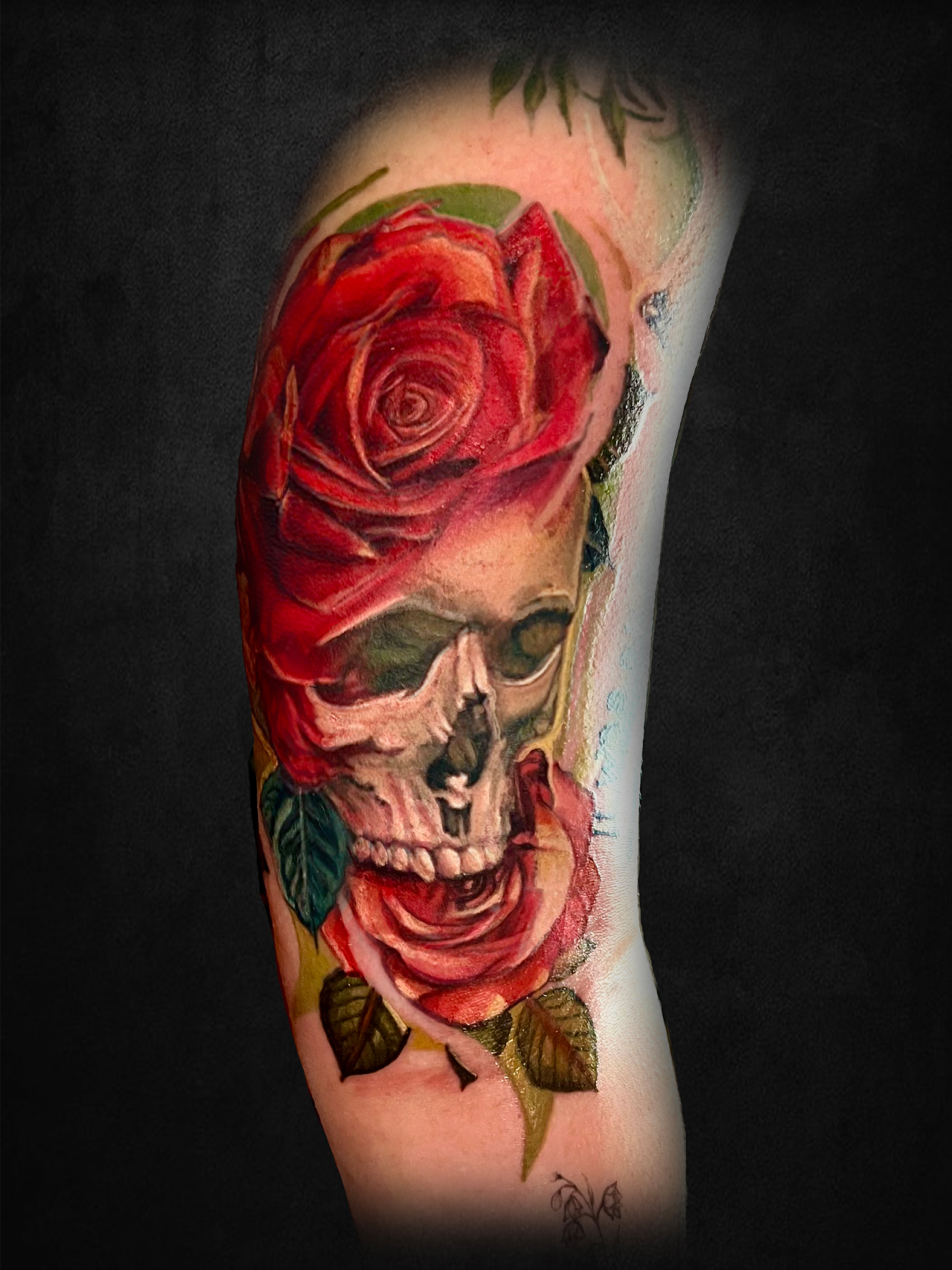 Skull and Roses Tattoo. Color. On Clients Inner Arm.